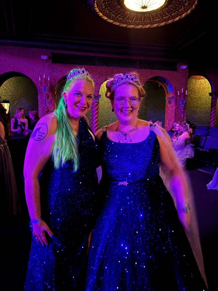 I made the horrible choice to wear heels. I don’t recommend in the future. My feet did not have fun. I didn’t do too much dancing because of said shoes, and from being very tired as I was at the Book Market event that morning. I am glad I went because I got to meet some wonderful people and booktok cosplayers as well! There was a professional picture of me taken that I don’t have yet, but when I get it, you’ll be sure to know. I have 2 more events before I call it quits until after the girls are born. The ball had some live music, and we even got to witness a proposal!! It was freaking adorable! Everyone dressed up so well, and seeing all the different fancy dresses was such a feast for the eyes.